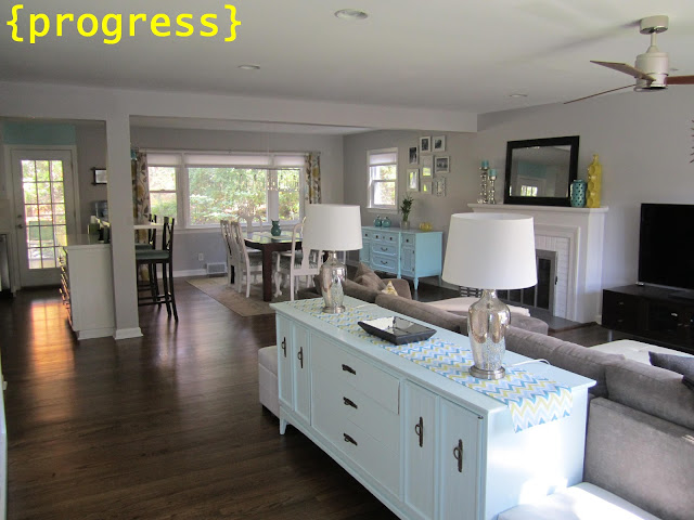 I figure I’ll start our home's tour in the “great” room of our house.  This space used to have a defined entry/hallway, living/dining room combo and kitchen.  We quickly changed that closed-off space to make it more "us".  So without further delay, here are entirely too many pictures of one area in our home.